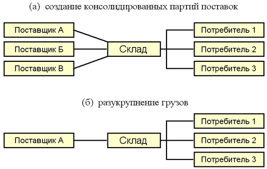 (3) разукрупнение грузов – сортировка грузов на более мелкие партии, предназначенные нескольким заказчикам (рис.6.1б);