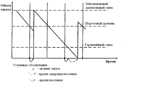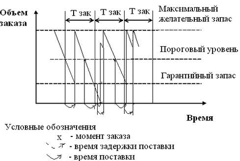 Пороговый уровень запаса в системе «минимум-максимум» играет роль «минимального» уровня. Если в установленный момент времени этот уровень пройден, т.е. наличный запас равен пороговому уровню, или не достигает его, то заказ оформляется. В противном случае заказ не выдается, и отслеживание порогового уровня, а также выдача заказа будут произведены только через заданный интервал времени.