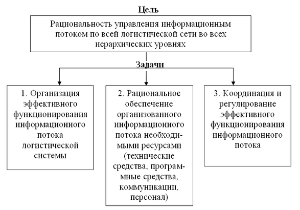 Своей главной цели обеспечения конкурентоспособности организации бизнеса на рынке логистика добивается посредством управления потоковыми процессами на основе правила «семи R-s » логистики. Очевидно, что главная цель информационной логистики – оптимально обеспечить этот процесс необходимой информацией. Таким образом, цель информационной логистики можно сформулировать как рациональное управление информационным потоком по всей логистической сети и на всех иерархических уровнях. Для достижения этой цели необходимо обеспечить реализацию совокупности трех взаимосвязанных задач, определяющих области и целевую направленность достижения цели (рис.9.2).