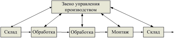 1. Принцип -«толкающей» внутрипроизводственной системы (концепции RP). Материалы, поступающие на производственный участок, у предыдущего технологического участка им не заказываются. Материальный поток «выталкивается» получателю по команде, поступающей на передающее (толкающее) звено из системы управления производством (рис. 3.1).