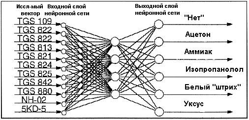 На этапе предварительной настройки ИНС предъявляются показания сенсоров (входной слой) и указываются химические вещества, которые этим показаниям соответствуют (выходной слой).