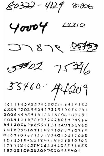 Показаны некоторые почтовые индексы (вверху) и уже изолированные цифры, подготовленные для распознавания (внизу). Видно, что индексы пишутся крайне неразборчиво, так, что сотрудники почты считают, что некоторые отправители в действительности не желают, чтобы их письма доходили по назначению. В связи с этим, к сожалению, большинство подобных систем распознавания имеют точность 95%, что является едва приемлемым показателем.
