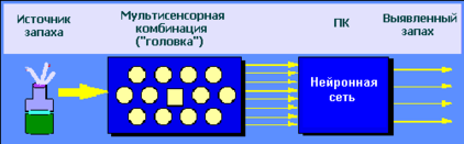 Применение ИНС позволяет отказаться от использования редких и дорогостоящих сенсоров. Используется, как правило, мультисенсорная комбинация («головка» или матрица), состоящая из набора (от 5 до 15) слабоселективных доступных по цене химических сенсоров.