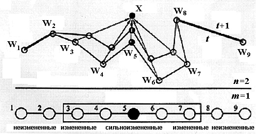 Нейроны 1, 2, 8 и 9 расположены вне окрестности вокруг «нейрона-победителя» c=5, поэтому их весовые векторы оставляются без изменения после показа сети образца, характеризующегося вектором X.