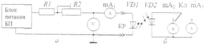 Электрическая схема стенда приведена на рис. 4. Она состоит из схемы питания светодиода и схемы блока измерения мощности излучения. Схемы включают следующие элементы: блок питания БП, предельное и регулировочное сопротивления R1 и R2 , миллиамперметр mA1 , вольтметр V, контактный разъем КР, светодиод VD1, фотодиод VD2 , измерительные миллиамперметры mA2 и mA3, переключатель Кл.