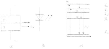 Рис: 1. Конструкция (а), условное графическое обозначение (б) и энергетические переходы светодиода (в)