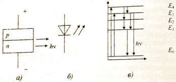 Рис: 1. Конструкция (а), условное графическое обозначение (б) и энергетические переходы светодиода (в)