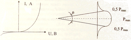 Излучение светодиода имеет угловую расходимость θ, показанную на рис. 3. Распределение мощности относительно оси излучения называется диаграммой направленности излучения. Количественной характеристикой расходимости является угол расходимости θ между двумя лучами, проведенными к точкам с уровнем 0,5 Рmax. Количественной характеристикой расходимости является также числовая апертура источника излучения, которая определяется как: NA = sin θ ,