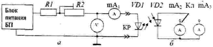 Электрическая схема стенда приведена на рис. 4. Она состоит из схемы питания светодиода и схемы блока измерения мощности излучения. Схемы включают следующие элементы: блок питания БП, предельное и регулировочное сопротивления R1 и R2 , миллиамперметр mA1 , вольтметр V, контактный разъем КР, светодиод VD1, фотодиод VD2 , измерительные миллиамперметры mA2 и mA3, переключатель Кл.