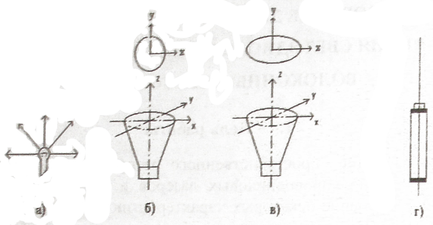 Рис. 1. Пространственное распределение излучения лампы (а), светодиода (б), полупроводникового лазера (в), твердотельного или газового лазера (г)