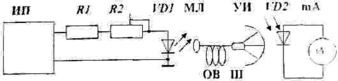 Схема включает: источник питания ИП, блокировочный резистор R1, регулятор тока R2, светодиод VD1, микролинзу МЛ, оптическое волокно ОВ, штекер с выходным концом волокна Ш, устройство углового измерения УИ, фотодиод VD2, миллиамперметр мА.