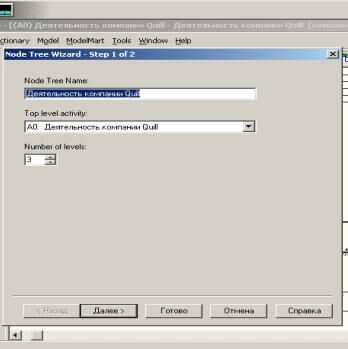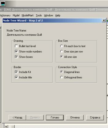 В диалоге Node Tree Definition следует указать глубину дерева — Number of Levels (по умолчанию — 3) и корень дерева (по умолчанию — родительская работа текущей диаграммы). По умолчанию нижний уровень декомпозиции показывается в виде списка, остальные работы — в виде прямоугольников. Для отображения всего дерева в виде прямоугольников следует выключить опцию Bullet Last Level. При создании дерева узлов следует указать имя диаграммы, поскольку, если в нескольких диаграммах в качестве корня на дереве узлов использовать одну и ту же работу, все эти диаграммы получат одинаковый номер (номер узла + постфикс N, например AON) и в списке открытых диаграмм (пункт меню Window) их можно будет различить только по имени.