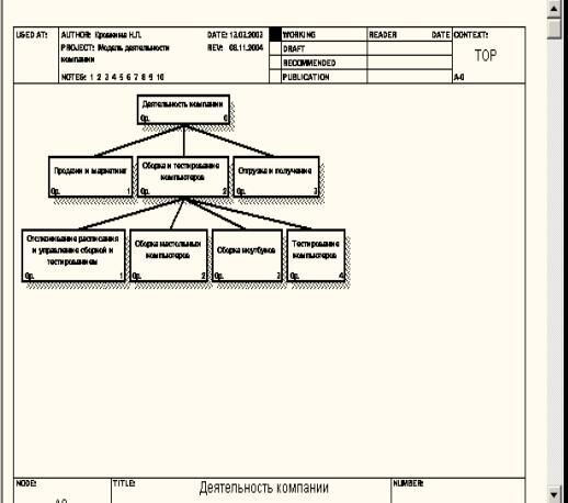 Диаграмма деревьев узловпоказывает иерархию работ в модели и позволяет рассмотреть всю модель целиком, но не показывает взаимосвязи между работами (рис. 7.26).Процесс создания модели работ является итерационным, следовательно, работы могут менять свое расположение в дереве узлов многократно. Чтобы не запутаться и проверить способ декомпозиции, следует после каждого изменения создавать диаграмму дерева узлов. Впрочем, BPwin имеет мощный инструмент навигации по модели — Model Explorer, который позволяет представить иерархию работ и диаграмм в удобном и компактном виде, однако составляющей стандарта IDEF0.