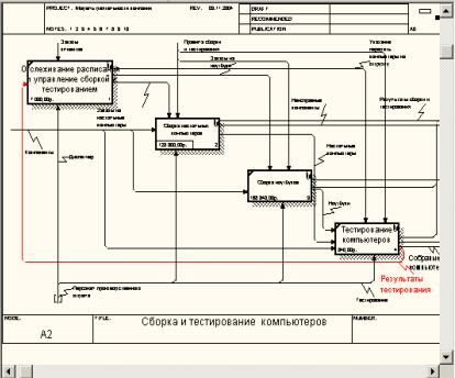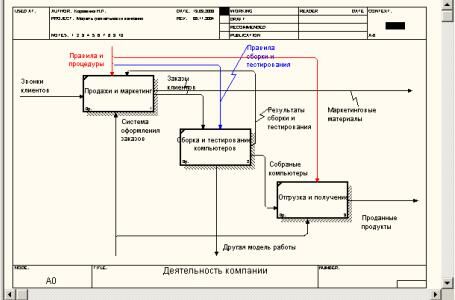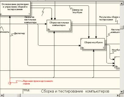 Связь по управлению(output-control), когда выход вышестоящей работы направляется на управление нижестоящей. Связь по управлению показывает доминирование вышестоящей работы. Данные или объекты выхода вышестоящей работы не меняются в нижестоящей. На рис. 7.16 стрелка "Заказы клиентов" связывает работы "Продажи и маркетинг" и "Сборка и тестирование компьютеров".