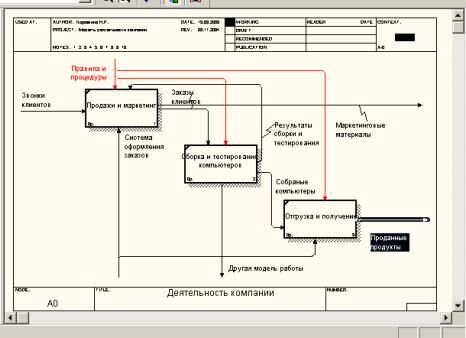 Разветвляющиеся и сливающиеся стрелки. Одни и те же данные или объекты, порожденные одной работой, могут использоваться сразу в нескольких других работах. С другой стороны, стрелки, порожденные в разных работах, могут представлять собой одинаковые или однородные данные или объекты, которые в дальнейшем используются или перерабатываются в одном месте. Для моделирования таких ситуаций в IDEF0 используются разветвляющиеся и сливающиеся стрелки. Для разветвления стрелки нужно в режиме редактирования стрелки щелкнуть по фрагменту стрелки и по соответствующему сегменту работы. Для слияния двух стрелок выхода нужно в режиме редактирования стрелки сначала щелкнуть по сегменту выхода работы, а затем по соответствующему фрагменту стрелки.