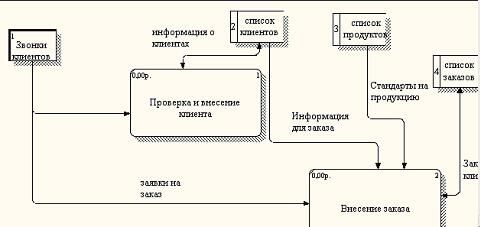 В DFD работы (процессы) представляют собой функции системы, преобразующие входы в выходы. Хотя работы изображаются прямоугольниками со скругленными углами, смысл их совпадает со смыслом работ IDEF0 и IDEF3. Так же, как процессы IDEF3, они имеют входы и выходы, но не поддерживают управления и механизмы, как IDEF0 (рис. 7.44) (блоки "Проверка и внесение клиентов", "Внесение заказов").