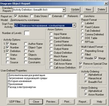 Каждой работе можно поставить в соответствие набор UDP. Для этого следует щелкнуть правой кнопкой мыши по работе и выбрать пункт меню UDP. В закладке UDP Values диалога IDEF0 Activity Properties можно задать значения UDP. Результат задания можно проанализировать в отчете Diagram Object Report (меню Tools/Report/Diagram Object Report) (рис. 7.42).