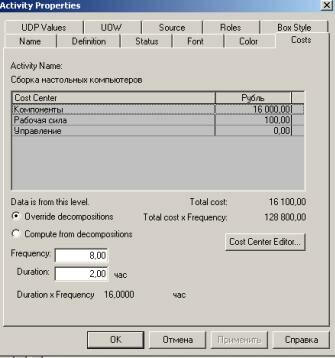 Для задания стоимости работы (для каждой работы на диаграмме декомпозиции) следует щелкнуть правой кнопкой мыши по работе и на всплывающем меню выбрать Cost (рис. 7.38). В диалоге Activity Cost указывается частота проведения данной работы в рамках общего процесса (окно Frequency) и продолжительность (Duration). Затем следует выбрать в списке один из центров затрат и в окне Cost задать его стоимость. Аналогично назначаются суммы по каждому центру затрат, т. е. задается стоимость каждой работы по каждой статье расхода. Если в процессе назначения стоимости возникает необходимость внесения дополнительных центров затрат, диалог Cost Center Editor вызывается прямо из диалога Activity Properties/Cost соответствующей кнопкой.