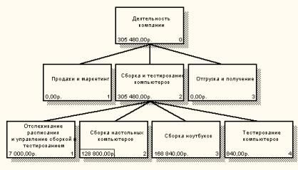 Общие затраты по работе рассчитываются как сумма по всем центрам затрат. При вычислении затрат вышестоящей (родительской) работы сначала вычисляется произведение затрат дочерней работы на частоту работы (число раз, которое работа выполняется в рамках проведения родительской работы), затем результаты складываются. Если во всех работах модели включен режим Compute from Decompositions (рис. 8.4), подобные вычисления автоматически проводятся по всей иерархии работ снизу вверх (рис. 7.39).