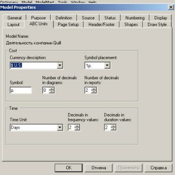 При проведении стоимостного анализа в BPwin сначала задаются единицы измерения времени и денег. Для задания единиц измерения следует вызвать диалог Model Properties (меню Model), закладка ABC Units (рис. 7.36).
