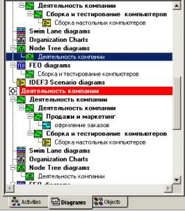 В результате дополнения диаграмм IDEF0 диаграммами DFD и IDEF3 может быть создана смешанная модель, которая наилучшим образом описывает все стороны деятельности предприятия. Иерархию работ в смешанной модели можно увидеть в окне Model Explorer (рис. 7.47). Модели в нотации IDEF0 изображаются зеленым цветом, в IDEF3 — желтым, в DFD — голубым.