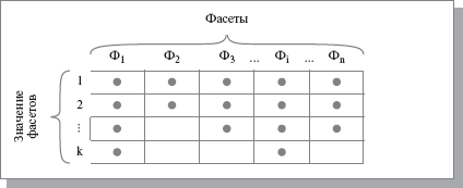 Под фасетным методом классификации понимается "параллельное разделение множества объектов на независимые классификационные группировки" [22]. При этом методе классификации заранее жесткой классификационной схемы и конечных группировок не создается. Разрабатывается лишь система таблиц признаков объектов классификации, называемых фасетами. При необходимости создания классификационной группировки для решения конкретной задачи осуществляется выборка необходимых признаков из фасетов и их объединение в определенной последовательности. Общий вид фасетной классификационной схемы представлен на рис. 8.4.
