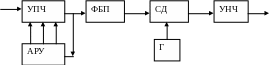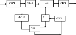 для сигналов с ОМ – СД (синхронный детектор). Обычно СД – это ФД, который формирует выходной сигнал с учетом не только разности фаз входных колебаний, но и их амплитуд. Для работы любого ФД необходимо опорное колебание. Для ОМ колебаний с остатком несущей опорное колебание выделяется в ФОН (фильтр остатка несущей) и поддерживается системой ФАП (рис.5). Для ОМ колебаний с полностью подавленной несущей опорное колебание формируется в высокостабильном генераторе (рис.6). Как следует из рисунков, перед СД ставится ФБП (фильтр боковой полосы), выделяющий спектр полезного сигнала, содержащийся в боковой полосе.