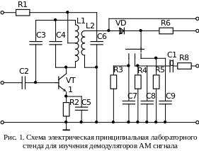 Лабораторный макет состоит из демодулятора АМ сигналов на диоде (рис. 1). Свойства АМ детектора подробно изучаются на примере диодного детектора, подключенного через индуктивность связи к резонансному контуру каскада предварительного усилителя на транзисторе КТ315А. Контур каскада настроен на частоту 465кГц. В качестве нагрузки детектора используется одна из трех