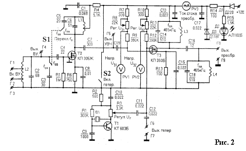 Смеситель выполнен на двухзатворном полевом транзисторе Т3 КП350Б с отдельным гетеродином. Сигнал
