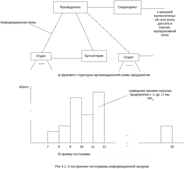 По структурно-организационной схеме предприятия, рис 4.1,а, для каждого рабочего часа определяется информационная нагрузка каждой информационной связи каждого структурного подразделения (отдела) предприятия.