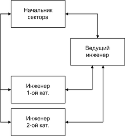 7.1.4 План производства. Настоящий алгоритм разрабатывается на базе научно-исследовательского института; при этом используются производственные мощности, имеющиеся непосредственно у предприятия. На рисунке 7.1 приведена организационная структура подразделения, задействованного в разработке всех модулей, необходимых для реализации алгоритма передачи данных с АРМ ДЛ на СОИКП.