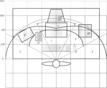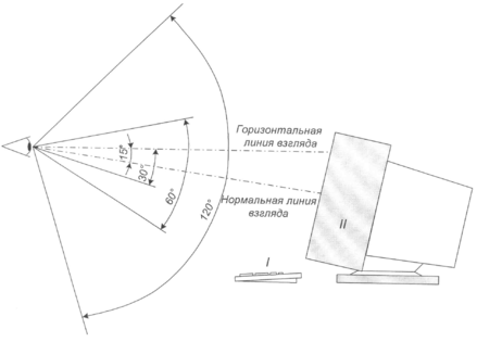 9.2.5 Средством отображения информации на рабочем месте является монитор. Расположение монитора в месте рабочей зоны должно обеспечивать удобство зрительного наблюдения в вертикальной плоскости под углом ±300 от нормальной линии взгляда оператора. Размещение средств отображения информации показано на рисунке 9.3.