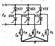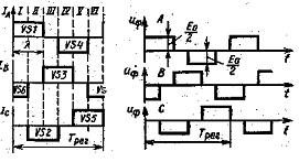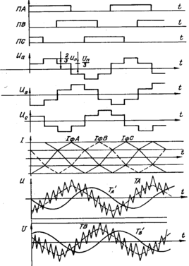 Продолжительность открытого состояния каждого тиристора , составляет половину или треть периода Тper=l/fper а сдвиг моментов открытия тиристоров VS1 — VS6 составляет шестую часть этого периода.