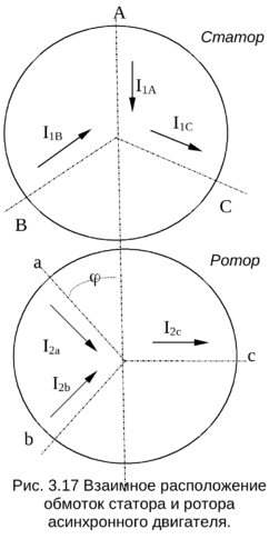 Определим величины потокосцеплений статора и ротора. Предположим, что статор и ротор трехфазного асинхронного двигателя имеют симметричные обмотки, воздушный зазор по всей окружности ротора одинаков, магнитное поле в воздушном зазоре распределено синусоидально, оси обмоток статора и ротора не совпадают, образуя произвольный угол j (рис. 3.17). Устанавливаем величину полного магнитного потока, сцепленного со статорной обмоткой фазы A. Для этого учитываем магнитные поля, созданные фазными токами I1A, I1B, I1C. Принимаем, что индуктивности фазных обмоток статора одинаковы и равны l1, взаимные индуктивности фаз A-B, A-C и B-C также одинаковы и равны l0 (по условиям симметрии асинхронной машины).