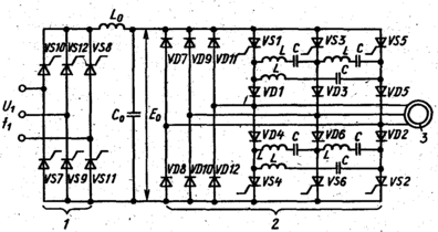На рис.3.11 показана схема силовой части ЭП с асинхронным двигателем 3, в котором использован ПЧ со звеном постоянного тока и автономный инвертор 2 напряжения. В этой схеме на выходе управляемого выпрямителя 1 включены реактор фильтра l0 и конденсатор Со, обеспечивающий вместе с диодами VD7— VD12 циркуляцию реактивной мощности. Автономный инвертор 2 напряжения выполнен на тиристорах VS1 — VS6. Конденсаторы С и реакторы L вместе с диодами VD1—VD6 образуют цепи искусственной коммутации, обеспечивающие выключение тиристоров VS1— VS6 в нужный момент. Амплитуда напряжения на выходе инвертора регулируется изменением напряжения Е0 на его входе с помощью блока управления выпрямителем 1, а его частота fper определяется частотой коммутации тиристоров VS1—VS6, задаваемой блоком управления инвертором.