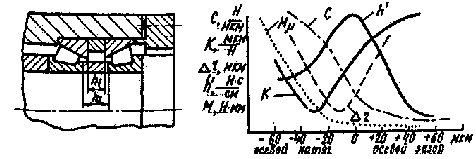 ис 2.1. Зависимость жесткости С, динамической податливости К, некруглости обработанных деталей r, момента трения М. и коэффициента демпфирования h от осевого зазора-натяга в конических роликоподшипниках.
