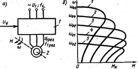 Рис.3. 5. Схема асинхронного ЭП (а) и механические характеристики АД (6) при частотном регулировании