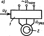 ля регулирования координат короткозамкнутого АД между сетью переменного тока со стандартным напряжением U 1ном и статором (рис.2 , а) двигателя 2 включен регулятор I напряжения, выходное напряжение которого U 1рег изменяется с помощью внешнего сигнала управления U. Изменяя величину этого сигнала, можно регулировать напряжение на статоре двигателя U 1рег в пределах от величины сетевого напряжения U 1ном и практически до нуля. При, этом частота напряжения на двигателе не изменяется и равна стандартной (50 Гц).