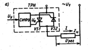 На рис. 3.3, а показана схема регулирования напряжения на однофазной нагрузке переменного тока Zy. Силовая часть однофазного ТРН образована двумя тиристорами VS1 и VS2, включенными по встречно-параллельной схеме, которая обеспечивает протекание тока в нагрузке в оба полу периода напряжения сети U1. Тиристоры получают импульсы управления U, от СИФУ, которая обеспечивает их сдвиг на угол управления в функции внешнего сигнала управления Uy.