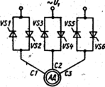 Осуществляя подачу импульсов управления на тиристоры с некоторой задержкой относительно предельного режима (угол управления О), то к нагрузке будет прикладываться часть напряжения сети (рис. 3.3,6). Изменяя угол управления а от нуля до , можно регулировать напряжение на нагрузке от полного напряжения сети до нуля. На основе однофазной схемы создаются трехфазное схемы для регулирования напряжения на статоре АД. Такая схема, состоящая из шести тиристоров VS1 — VS6, доказана на рис. 3.4