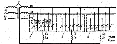 дна из распространенных тиристорных схем трехфазного ПЧ (НПЧ) состоит из трех одинаковых комплектов 2—4 тиристоров (рис.3.8), обеспечивающих питание обмоток статора АД zа,zв,zс.