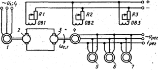 На рис.3.6. приведена схема ПЧ с синхронным генератором 3, от которого питаются три асинхронных двигателя 5—7. Преобразователь состоит из двух частей: агрегата постоянной скорости, включающего асинхронный двигатель 1 и приводимый им генератор постоянного тока 2, и агрегата переменной скорости, состоящего из регулируемого двигателя постоянного тока 3, приводящего во вращение синхронный генератор переменной частоты. Двигатель 1 питается от сети со стандартной частотой f1 = 50 Гц, а на выводах синхронного генератора 4 частота и напряжение могут регулироваться. С помощью резистора R1 в цепи обмотки возбуждения генератора 2 изменяется напряжение, подводимое к якорю двигателя 3, и тем самым его скорость и скорость генератора 4. При этом меняется частота напряжения на выводах синхронного генератора 4, определяемая выражением fрег=pсг/(2) , и на двигателях 5—7. Напряжение на этих двигателях регулируется с помощью резистора R3, включенного в цепь обмотки возбуждения синхронного генератора 4.