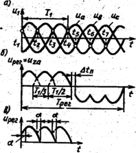 Фазные напряжения на вторичных обмотках трансформатора 1 изменяются по синусоидальному закону (рис.3.9 , а), а нагрузка имеет активный характер (если нагрузкой является АД, то ее характер будет активно-индуктивный),