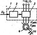 Напряжение сети U1 стандартной частоты f1 подается на вход управляемого выпрямителя 2, преобразующего переменное напряжение U1 в постоянное Е0. Это напряжение можно регулировать в широких пределах с помощью блока управления. Выпрямленное и регулируемое напряжение E0 подается на вход инвертора 3, который преобразует напряжение постоянного тока Е0 в трехфазное напряжение Uрег регулируемой частоты fрег, которое подается на двигатель 4. Частота выходного напряжения fрег инвертора регулируется блоком 5 управления в функции сигнала управления Uy.1