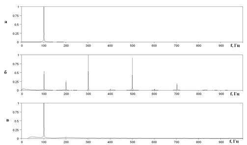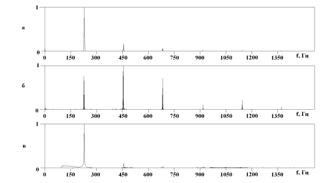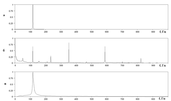 Рис. 23. Спектры зарегистрированного и обработанного синусоидального акустического воздействия пьезокерамического модулятора