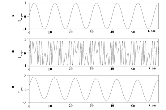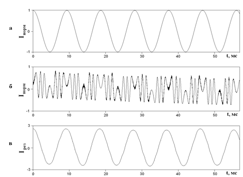 Рис. 22. Регистрация синусоидального аукстического воздействия частотой 100 Гц, подаваемого на модулятор.