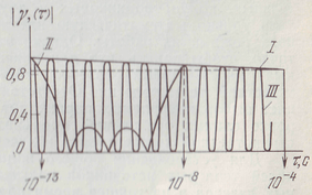 | Рис. 1.1 Зависимости степени когерентности от нормированного расстояния между симметричными точками пучка излучения для многомодового режима работы газового лазера | Рис. 1.2 Вид функций временной когерентности для трех режимом работы газового лазера: I — одна частота; II — четыре частоты равной интенсивности (одна линия); III — две линии |