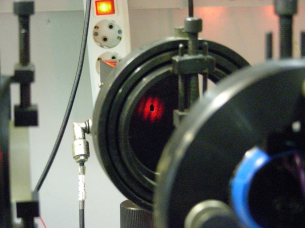 Ставим экран (3) рядом с лазером (1) и перемечая лазер делаем так, что бы пятно лазерного излучения было в центре экрана. Затем ставим экран в конце оптической скамьи и юстировочными винтами лазера добиваемся что бы пятно лазерного излучения попало в центр экрана. Опять ставим экран ближе к лазеру, если пятно осталось в центре экрана, то фиксируем лазер, если же пятно немного сместилось, то стоит проделать юстировку пока пятна лазерного излучения в разных положениях экрана не будут по центру.