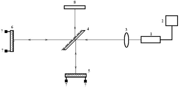 Второй способ: собираем схему (рис. 2), зеркало (6) устанавливаем в самом конце оптической скамьи. На экране (8) наблюдаем два пятна от зеркал (5) и (6) разного размера. Двигаем лазер на миллиметра и добиваемся что бы оба пятна были одинаково размера.