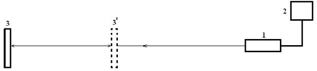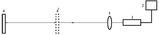 Ставим экран (3) рядом с лазером (1) и перемещая лазер делаем так, что бы пятно лазерного излучения было в центре экрана. Затем ставим экран в конце оптической скамьи и юстировочными винтами лазера, добиваемся что бы пятно лазерного излучения попало в центр экрана. Опять ставим экран ближе к лазеру, если пятно осталось в центре экрана, то фиксируем лазер, если же пятно немного сместилось, то стоит проделать юстировку пока пятно лазерного излучения в разных положениях экрана не будет по центру.
